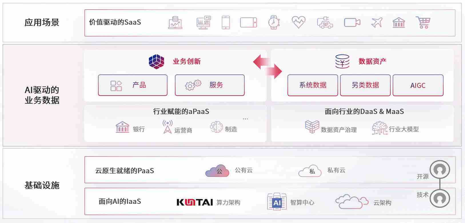数字时代,,,围绕企业数字化转型的关键要素,,杏宇娱乐数码开创性的提出数云融合战略和技术体系框架,,,着力在云原生、、、、数字原生、、、、AI原生和信创产业上架构产品和服务能力,,,,为处在不同数字化转型阶段的快消零售、、、汽车、、金融、、、、医疗、、、、政企、、、、教育、、运营商等行业客户提供泛在的敏捷IT能力和融合的数据驱动能力,,,,构建跨界融合创新的数字业务场景和新业务模式,,,助力企业级客户建立面向未来的核心能力和竞争优势,,全面推动社会的数字化、、智能化转型升级。。