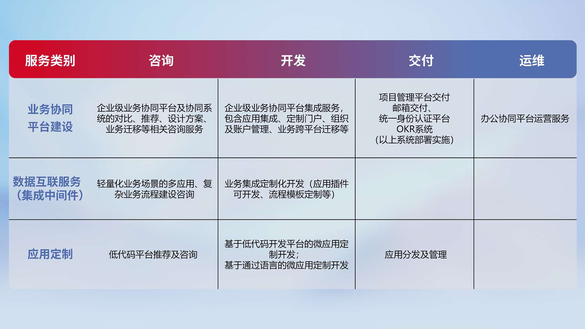 针对钉钉、、、、企微、、IDaas等平台级产品提供产品的规划、、、、方案、、交付、、、定制化开发等服务,,实现如统一协同办公、、、智能客户服务、、、、混合会议管理、、智能数据查询、、等业务场景,,实现数字化转型。。。
